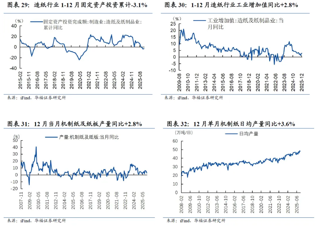 造纸业1-12月固定资产投资额同比下降。1-12月造纸行业整体固定资产投资累计同比-3.1%,增速环比1-11月+0.7pct。1-12月造纸行业工业增加值同比+2.8%,增速环比1-11月+0.4pct。造纸产量方面,12月当月机制纸及纸板产量同比+2.8%,日均产量同比+3.6%。