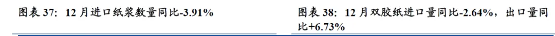 12月纸浆进口量同比-3.91%,12月双胶纸、箱板纸进口量同比下降,瓦楞纸进口量同比增长。纸浆方面,12月进口数量311.34万吨,同比-3.91%,环比-4.2%。文化用纸方面,12月双胶纸进口量同比-2.64%,环比+57.28%;出口量同比+6.73%,环比+3.95%;包装纸方面,12月箱板纸进口量37.42万吨,同比-6.1%,环比+37.4%;瓦楞纸进口量25.95万吨,同比+15.5%,环比+44.1%。