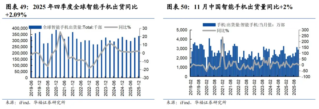 25年四季度全球智能手机出货量保持正增长,11月中国智能手机出货量同比保持增长。2025年四季度全球智能手机出货量同比+2.28%,增速环比三季度+0.19pct;11月中国智能手机出货量2875.1万部,同比+2%、环比-8.31%。
