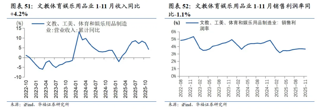 1-11月文娱用品行业营收增速增长,利润率环比上涨。从工业企业规模以上制造业效益来看,文教、工美、体育和娱乐用品业1-11月营业收入累计同比+4.2%,增速环比1-10月-3.3pct;1-11月累计销售利润率3.7%,同比-1.1%,环比1-10月-0.03pct。