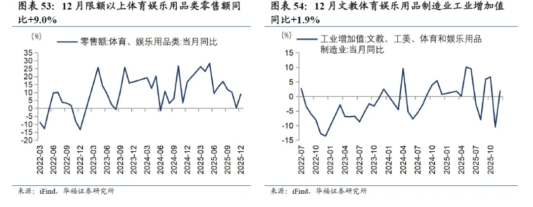 12月限额以上体育娱乐用品类零售额同比+9.0%,增速环比11月+8.6pct;12月文教体育娱乐用品制造业工业增加值同比+1.9%,增速环比11月+12.4pct。