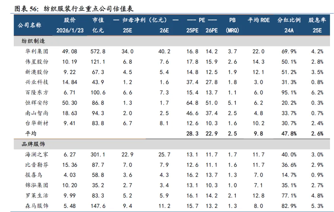 6)新型烟草:①12月电子烟出口额约为9.74亿美元,同比-3.67%,环比-11.09%;2025年全年我国电子烟出口总额为105.98亿美元,同比-3.31%。美国作为最大的市场,25年我国对美出口同比+10.9%,仍保持较快增长,若未来FDA对电子烟的监管力度持续加强,合规企业份额有望修复。②随着国际烟草龙头HNB产品登陆主流市场,公司相关新型烟草产品在新区域的销售有望贡献增量;英国等欧洲地区有望向盈利能力更强的换弹式、开放式切换;全球特别是美国电子烟执法力度显著加强,合规产品份额恢复空间显著。建议关注思摩尔国际,公司雾化电子烟、HNB、雾化美容、雾化医疗等多元业务逐步进入收获期,后续各类产品全球推出、多点催化可期。7)纺织服装:鲁泰A发布2025年度业绩预告,公司预计归母净利润5.7亿元至6.3亿元,同比+38.92%至53.54%;扣非净利润3.7亿元至4.3亿元。净利润增长主因出售交易性金融资产获得投资收益及所持有交易性金融资产产生公允价值变动等收益,上述收益计入非经常性损益,增加净利润约17,000万元。受线上大促及降温天气影响,保暖及运动鞋服类购买需求提升,运动服饰、户外相关标的建议关注安踏、李宁、361度、三夫户外、探路者、牧高笛等。> 风险提示:宏观经济环境波动风险、原材料价格大幅上涨风险。