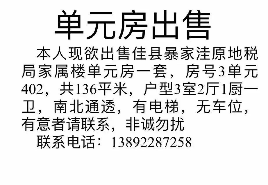 出售:佳县公路段家属楼单元,黄金楼层,非诚勿扰,电话:18992291606;18992292208 |