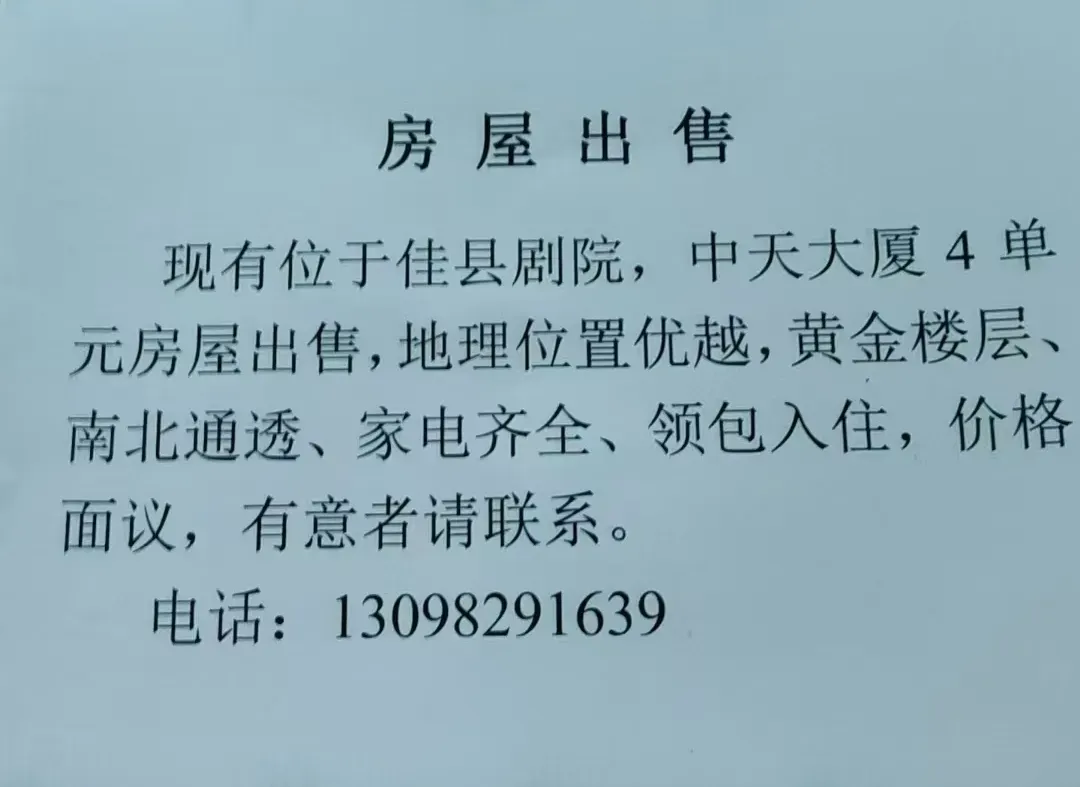 出售:佳县中天大厦单元一套,三室两厅一卫,精装修,有意向致电:13629128955 |