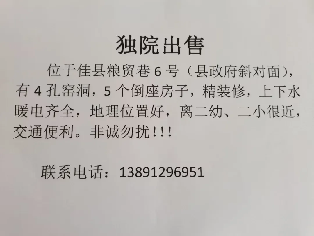 出售:佳县暴家洼三岔路口交警队下面独院,三孔窑洞,两个倒座房,新装修,有上下水、天然气,脑畔彩钢防水,房产证在手。联系13325326522。