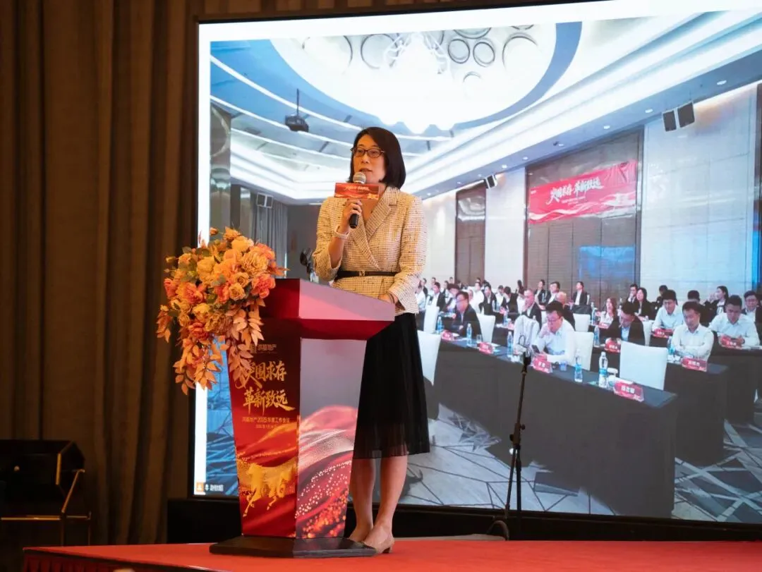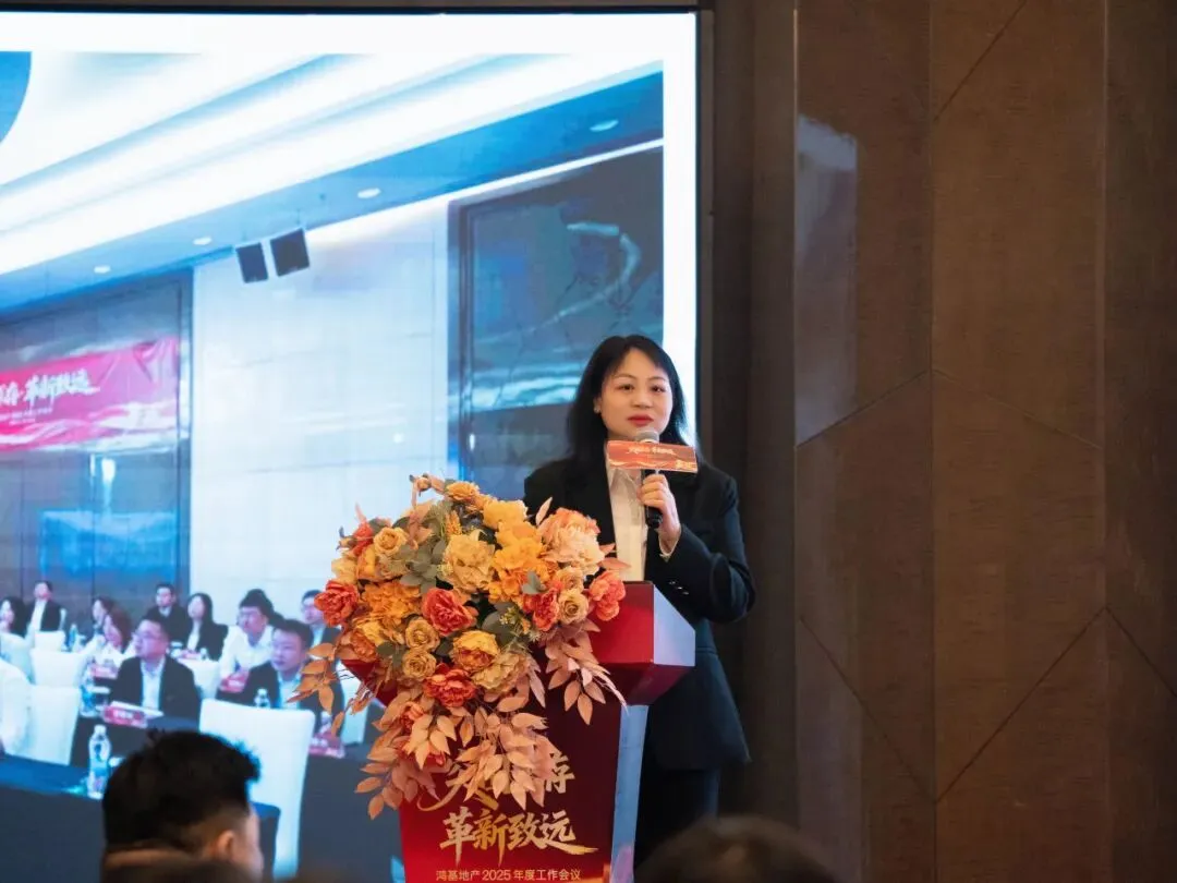 会议伊始,由综合管理部部长熊冬阳女士围绕地产集团2025年度经营业绩进行全面总结,并对2026年发展目标与核心路径进行了系统阐述。她指出,在过去一年充满挑战的市场环境中,鸿基地产始终以“突围求存”的信念主动破局,以前瞻决策与高效执行应对考验,取得了来之不易的突破性成果。