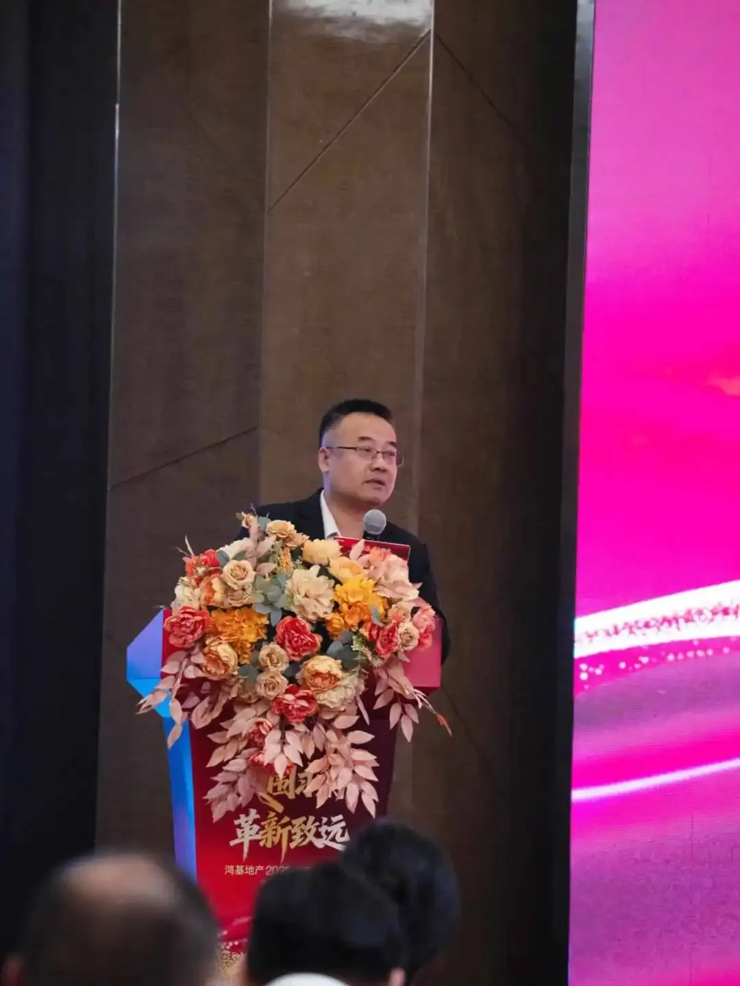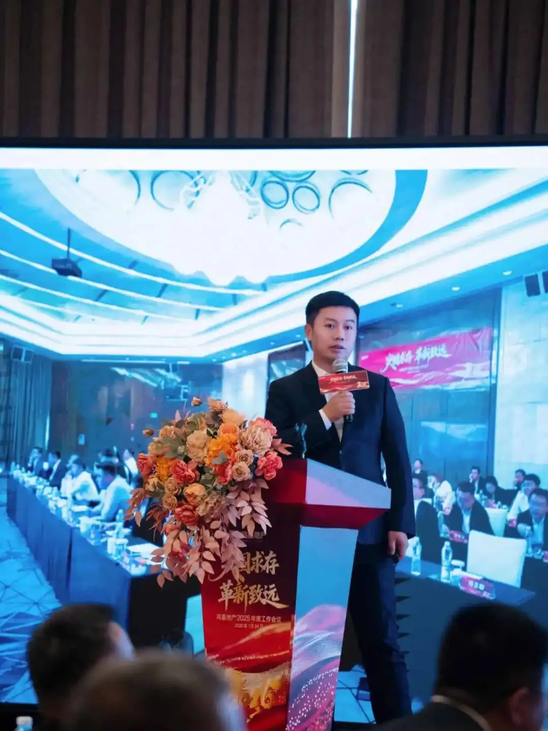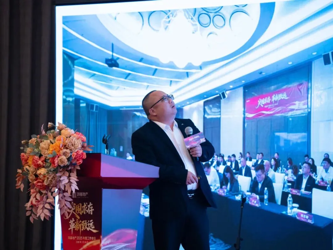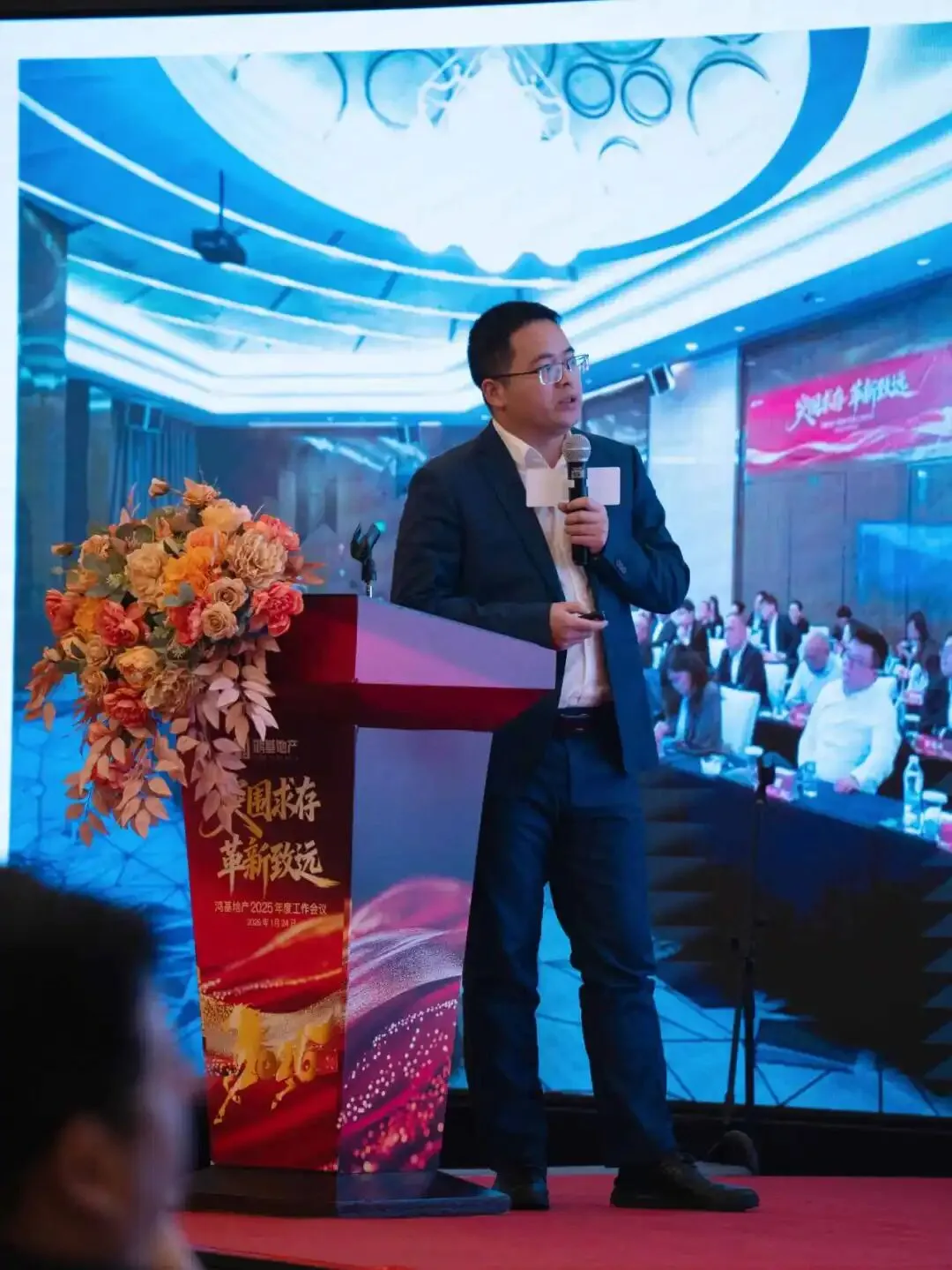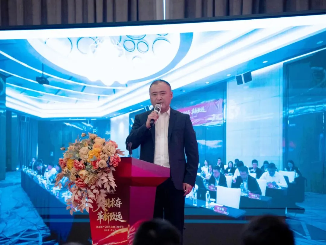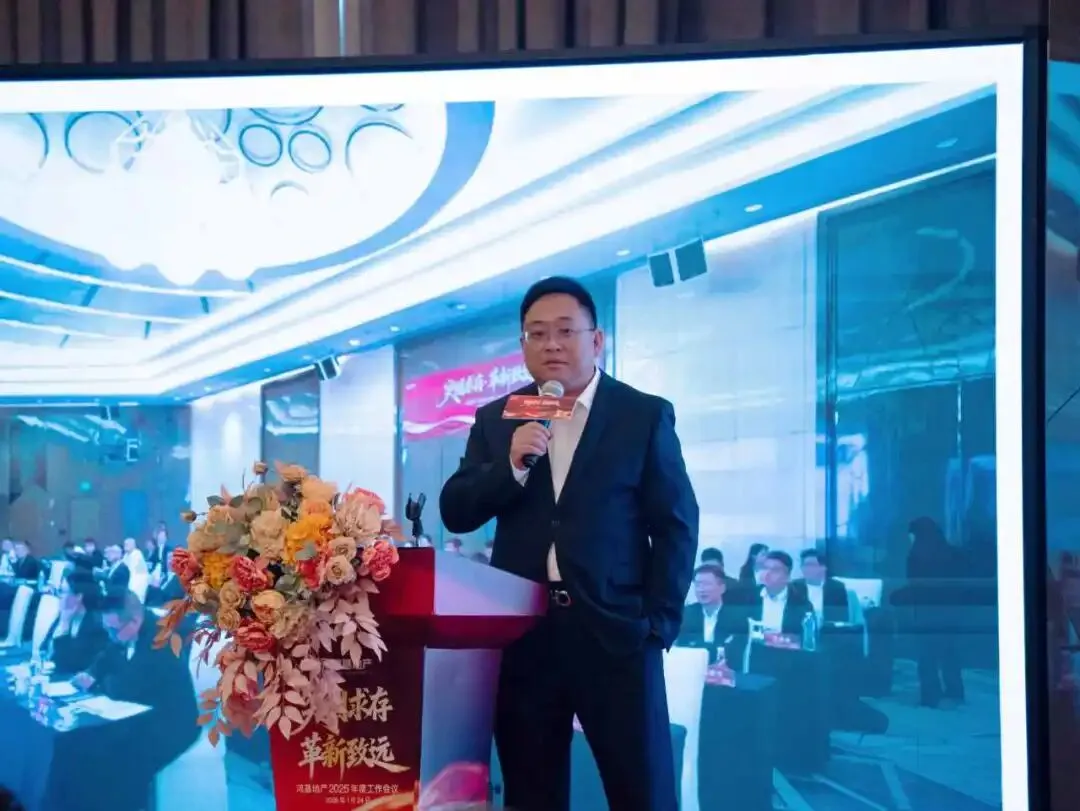 会议最后,鸿基地产董事长陈龙先生作重要讲话。董事长首先肯定了公司各项目及部门在2025年所取得的成就,并指出当前地产形势依然严峻,各项目能够维持运营已属不易,公司能如期召开年会,表现已优于部分同行。