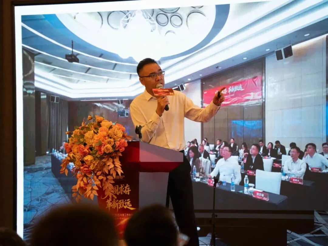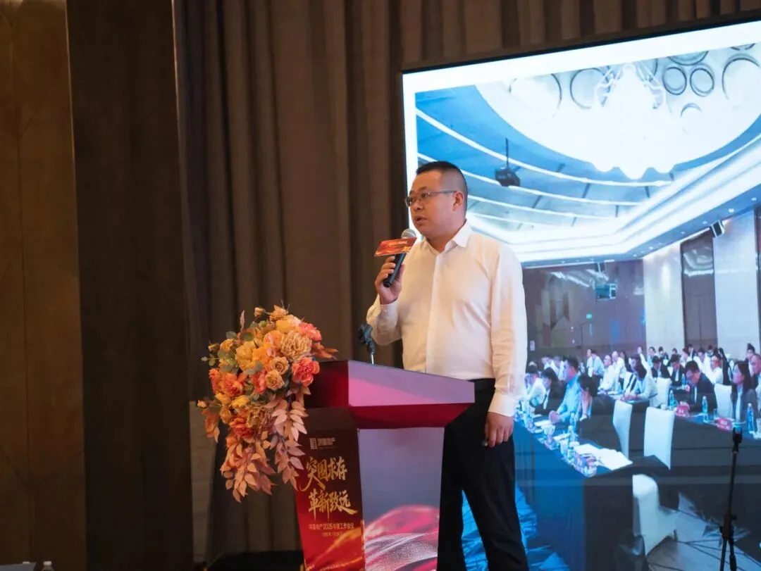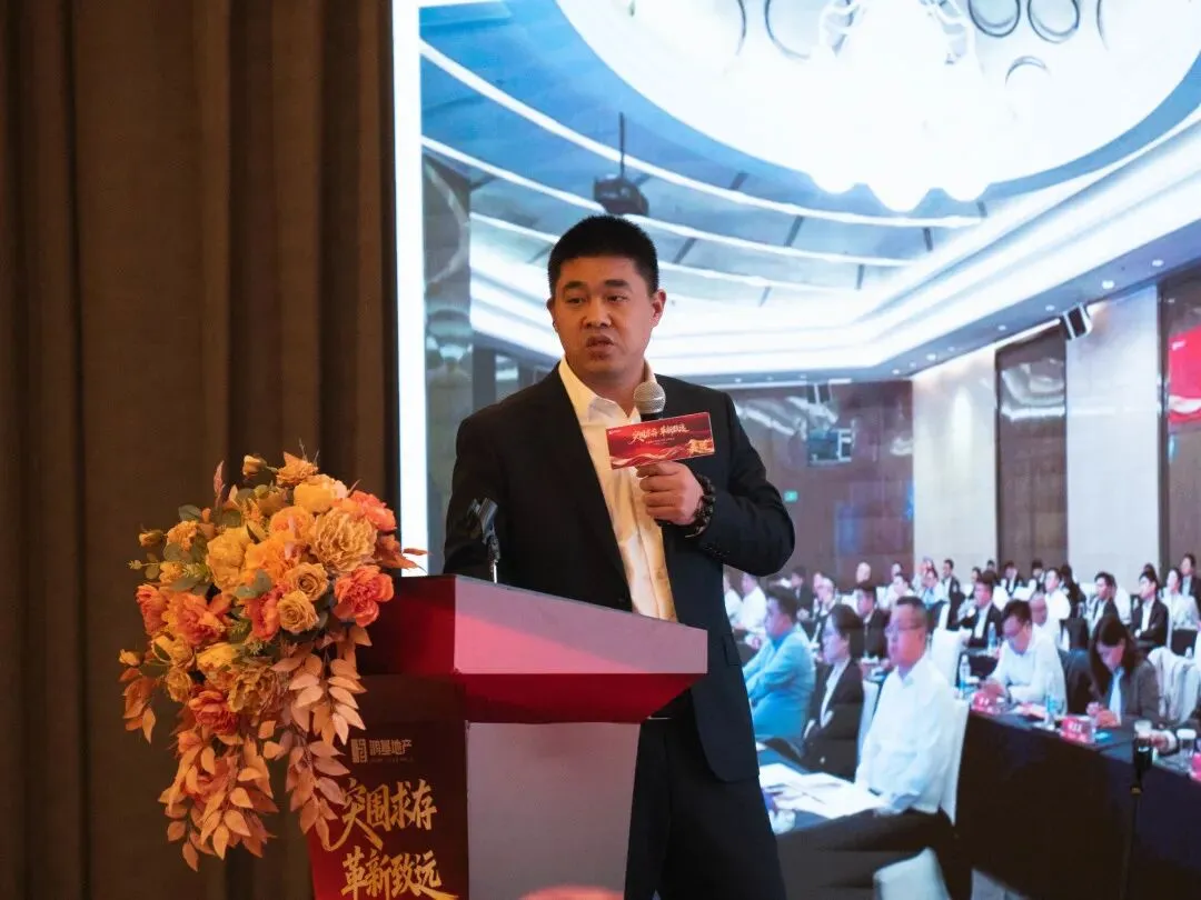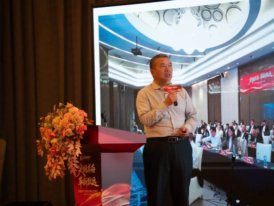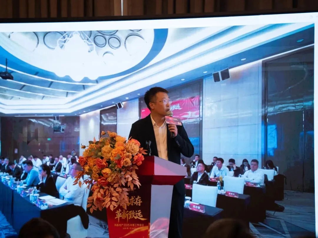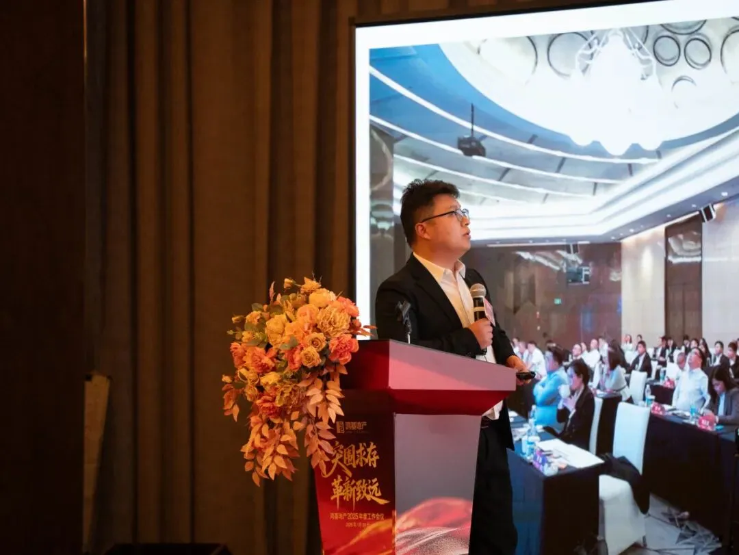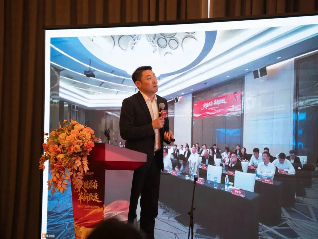 会议最后,鸿基地产董事长陈龙先生作重要讲话。董事长首先肯定了公司各项目及部门在2025年所取得的成就,并指出当前地产形势依然严峻,各项目能够维持运营已属不易,公司能如期召开年会,表现已优于部分同行。