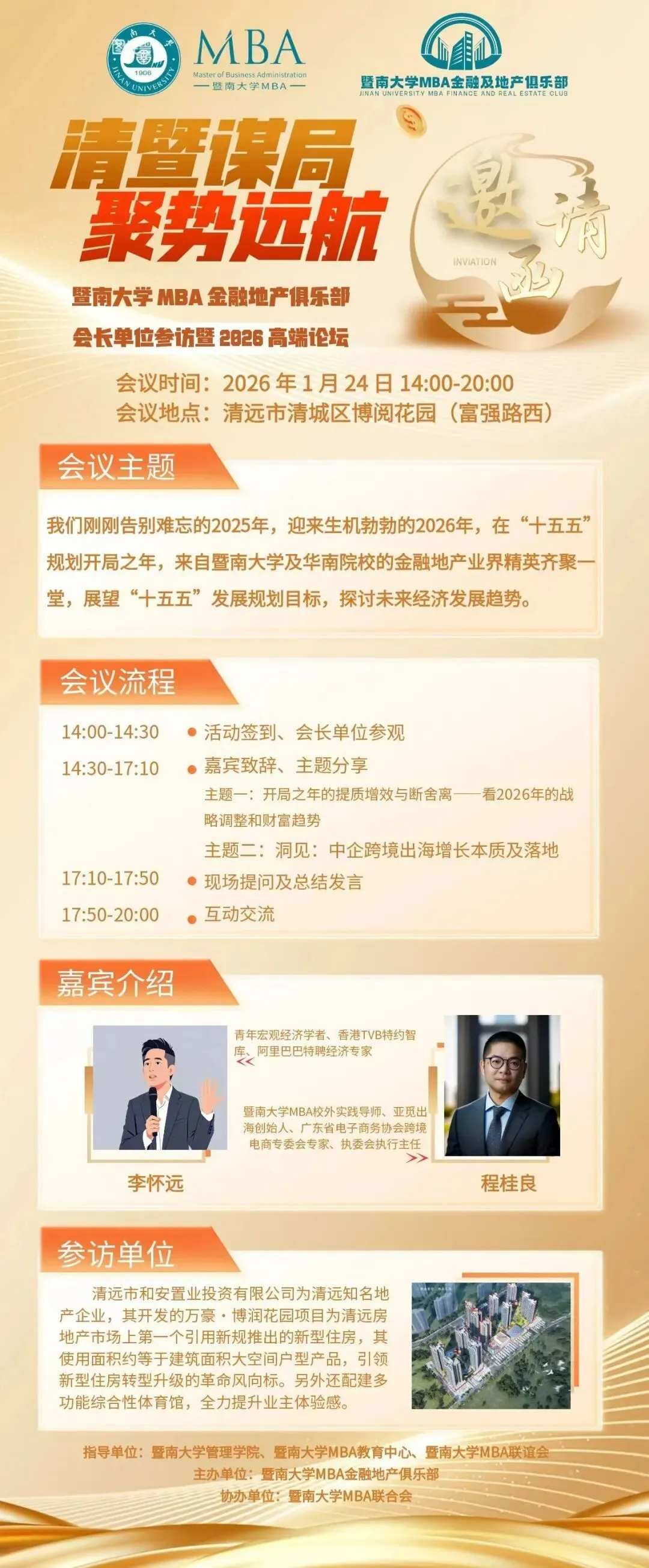清远,2026年1月24日——今日下午,由暨南大学MBA金融地产俱乐部主办的“谋局·聚势·远航”2026高端论坛在清远市清城区博阅花园隆重举行。本次活动汇聚了来自暨南大学及华南地区多所高校的金融地产业界精英、学者专家与企业代表,在“十五五”规划开局之年,共同探讨未来经济发展趋势、行业战略调整与跨境出海新机遇。