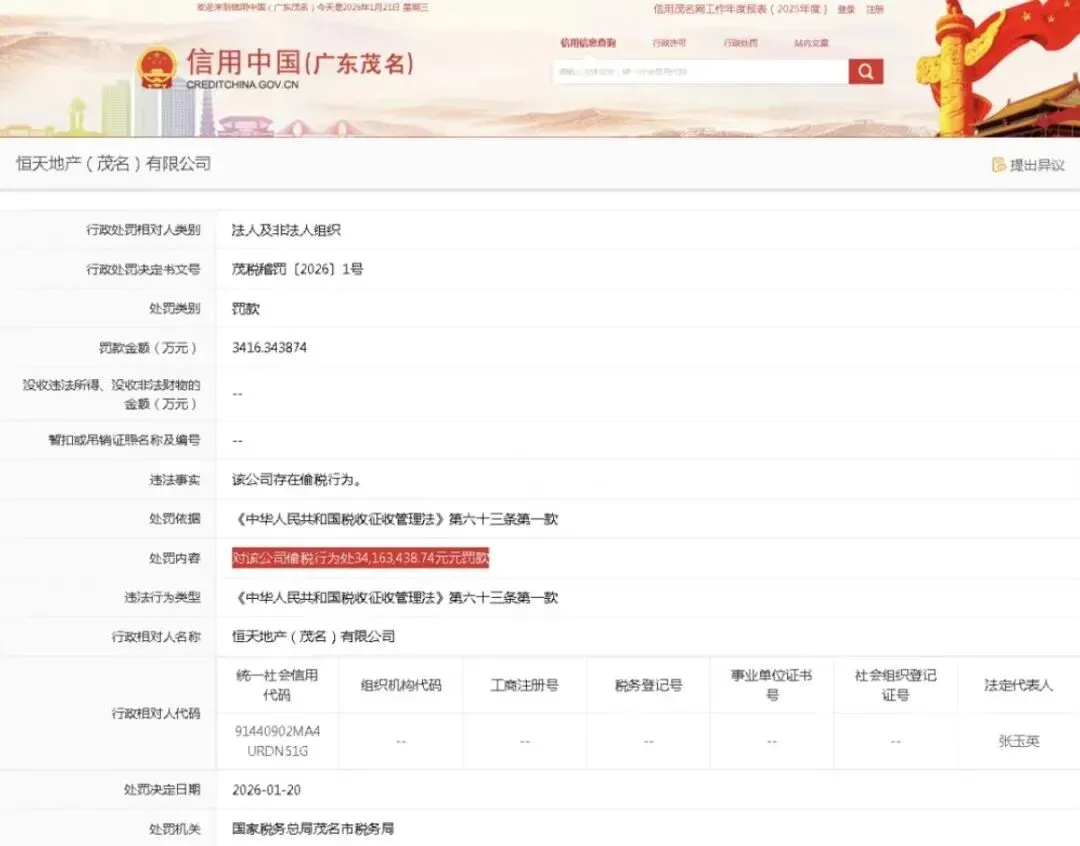 信用中国网站显示,**地产(茂名)有限公司因偷税行为被茂名市税务局稽查局处以巨额罚款,金额高达3416.343874万元。行政处罚决定书(文号:茂税稽罚〔2026〕1号)明确指出,其行为违反了《中华人民共和国税收征收管理法》第六十三条第一款规定,构成偷税。处罚决定已于2026年1月20日作出。该信息属于公开的行政处罚记录,提醒所有企业:依法诚信纳税是每个市场主体的法定义务,切勿心存侥幸。偷逃税款不仅面临高额罚款,还将严重影响企业信用。