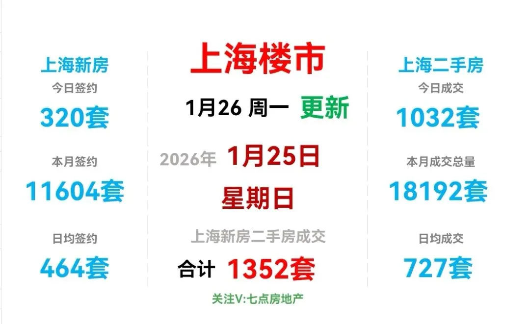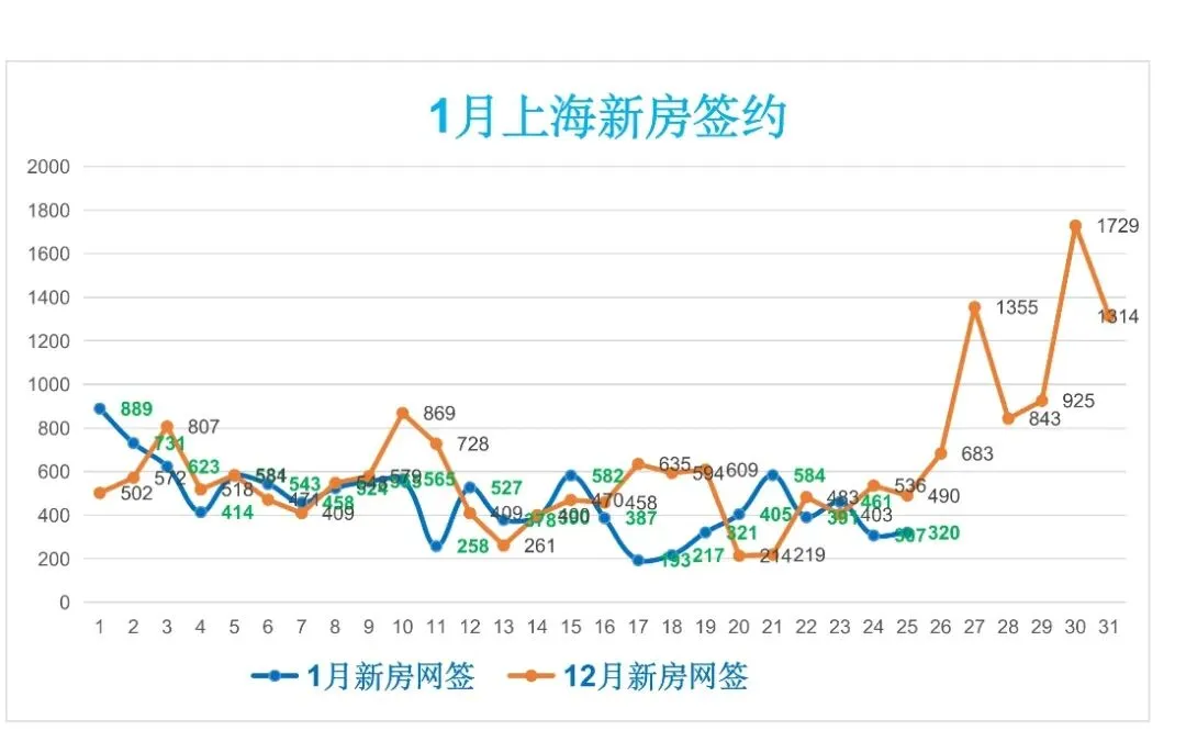 🏠昨日(1月25日,周日),上海新房签约320套,较前一日增加13套(增幅4.23%),日签约面积2.14万m²,套均面积66.88m²。
