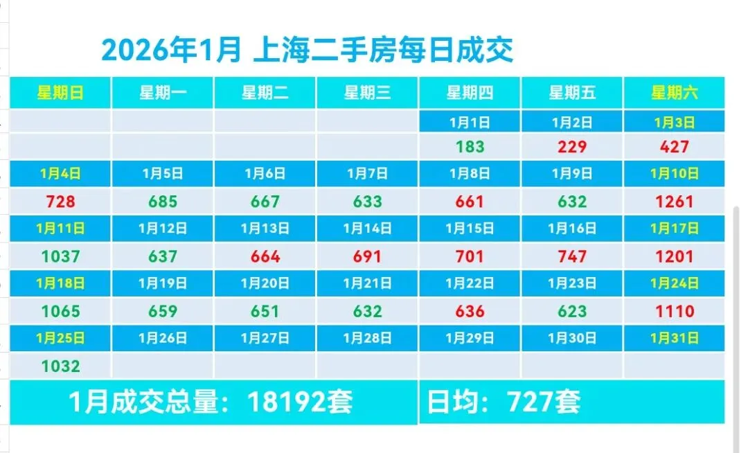 🏡1月,上海二手房成交量累计18192套,日均成交727套,较上个月日均减少13套(降幅1.76%)。