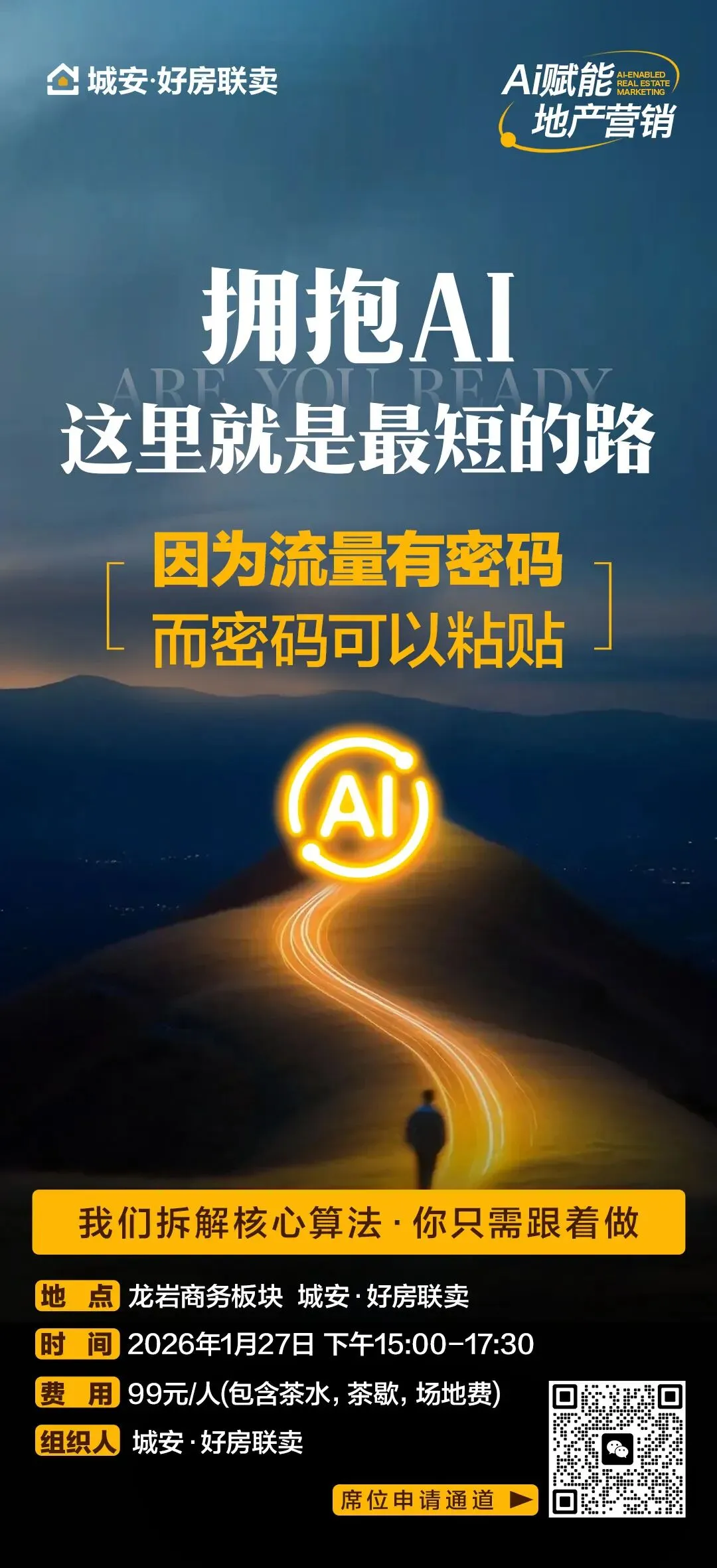 主题:AI赋能地产营销·流量密码实战拆解时间:2026年1月27日 15:00-17:30地点:龙岩商务板块·城安·好房联卖费用:99元/人(含茶歇与资料)主办:城安·好房联卖