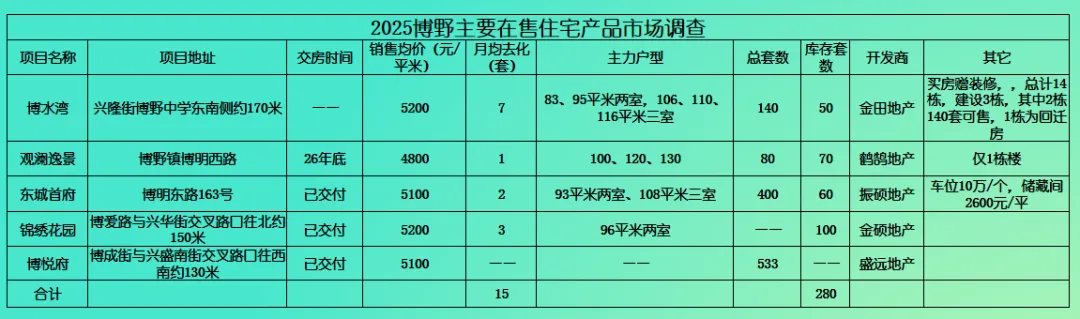 目前在博野县城,住宅在售项目以博水湾、观澜逸景、东城首府、锦绣花园、博悦府等项目为主,其中仅博水湾项目为23年拿地24年入市,其余项目则主要为23年以前就开发上市的存量项目(观澜逸景项目1栋楼为25年入市,但拿地较早)。各项目产品户型相较于当前主流市场户型存在着较大差距,各项目开发商的产品开发与营销手段也相对落后。