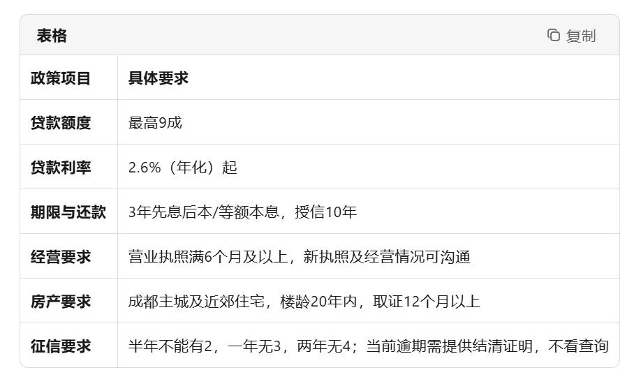 该产品要求营业执照满6个月(新执照可沟通),限成都主城及近郊20年内住宅,征信需满足"半年无2、一年无3、两年无4",不看查询次数,10年授信期内可随借随还。