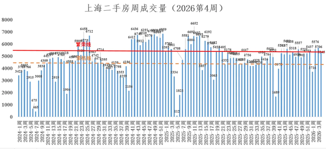 2026年第4周,上海二手房成交5343套,环比下跌6.4%。本周虽然未能超过5500套,但差距并不太大。至此已连续第三周成交量站上5000套。