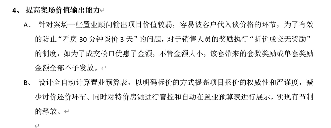 针对案场一些置业顾问输出项目价值较弱,容易被客户代入谈价格的环节,为了有效的防止“看房30分钟谈价3天”的问题,对于销售人员的奖励执行“折价成交无奖励”的制度,如为了成交松口优惠了金额,不管金额大小,该套带来的套数奖励或单套奖励金额全部不予发放。