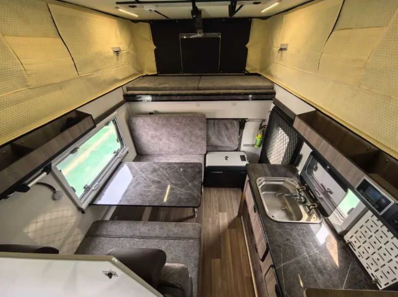 【上装配件】12V直流空调,多美达房车专用冰箱,驻车燃油暖风,驻车燃油热水,不锈钢水槽,菲亚玛双向换气扇,富森蓝牙音响、独立卫生间,多美达抽拉马桶,淋浴花洒、菲亚玛户外遮阳棚,户外翻折桌板,户外淋浴接口,后挂行李箱,后方口拖车杠,侧边帐,T-man打气泵