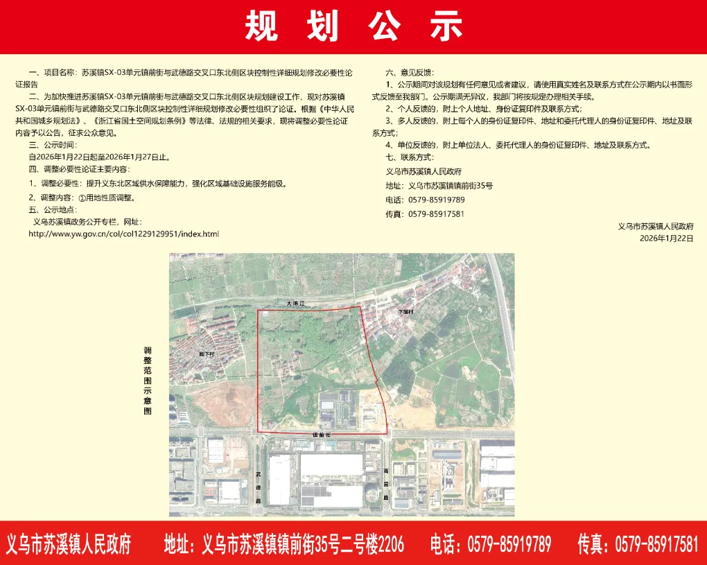 1月22日,义乌市苏溪镇SX-03单元镇前街与武德路交叉口东北侧区块控制性详细规划修改必要性论证报告公示。为加快推进苏溪镇SX-03单元镇前街与武德路交叉口东北侧区块规划建设工作,现对苏溪镇SX-03单元镇前街与武德路交叉口东北侧区块控制性详细规划修改必要性组织了论证。根据《中华人民共和国城乡规划法》、《浙江省国土空间规划条例》等法律、法规的相关要求,现将调整必要性论证内容予以公告,征求公众意见。