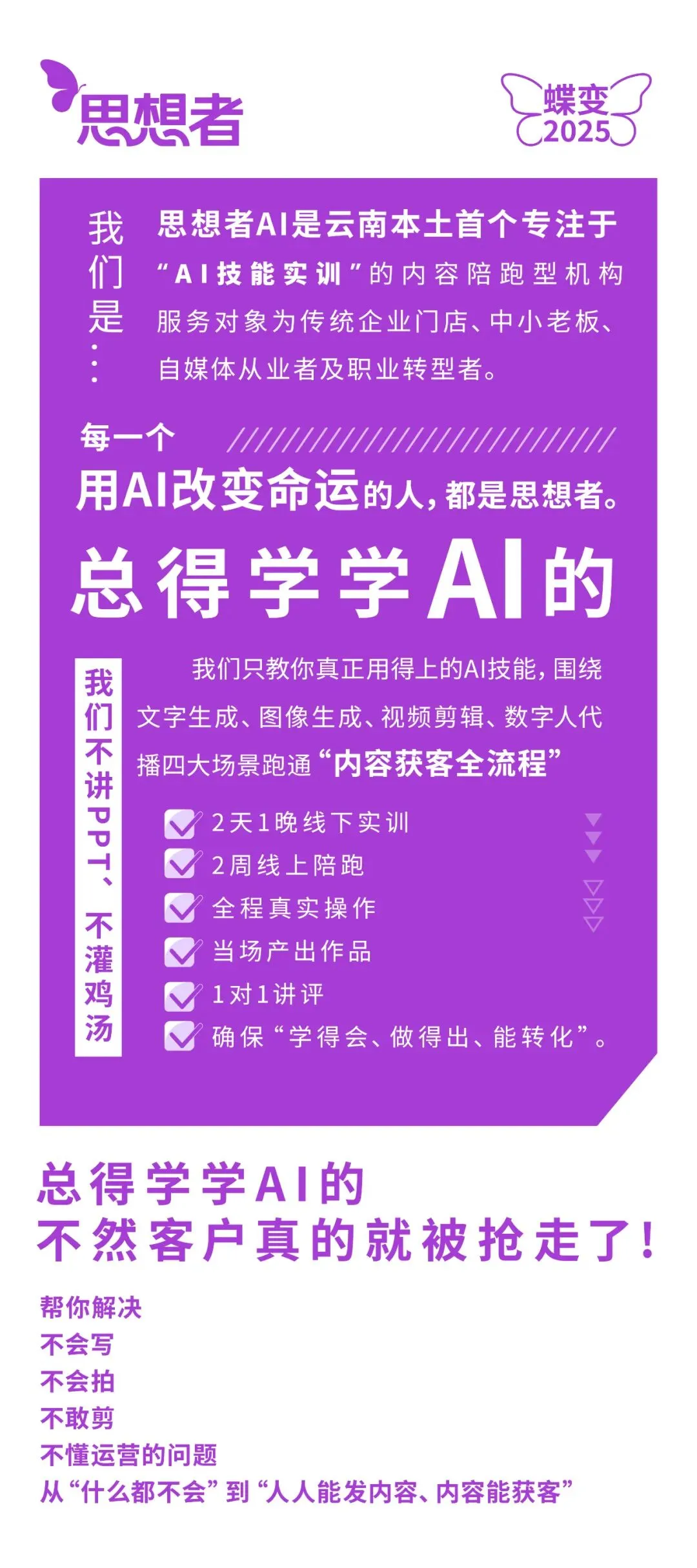我们深耕云南,融合10余年营销与内容实战经验,围绕AI文字、图像、视频、数字人等核心能力,打造系统化课程体系,贯穿学习—实操—变现的全流程陪跑路径。课程不仅教你学会AI,更教你用AI跑通内容创作、账号运营、IP打造、个人副业、企业增长等关键环节,真正实现降本增效与能力蝶变。目前已服务百余家企业与多个行业客户,持续赋能中小企业主、创业者、职场人与内容创作者。