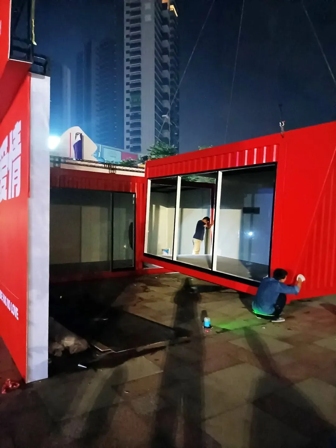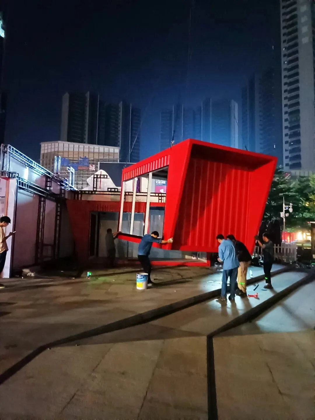 这座建筑的诞生,始于斯帝建筑的数字化工厂。标志性的「爱情红」由全自动喷涂系统精密实现,确保每一寸色彩饱满均匀。内部空间、灯光与多媒体系统,均在出厂前完成集成与调试。当夜幕降临,这个满载品牌故事的红色容器启程出发,于黎明之前抵达场地。天色既明,现场团队迅速展开作业:精准定位、快速对接、系统启动。整个过程高效而安静,将对城市日常的干扰降至最低。