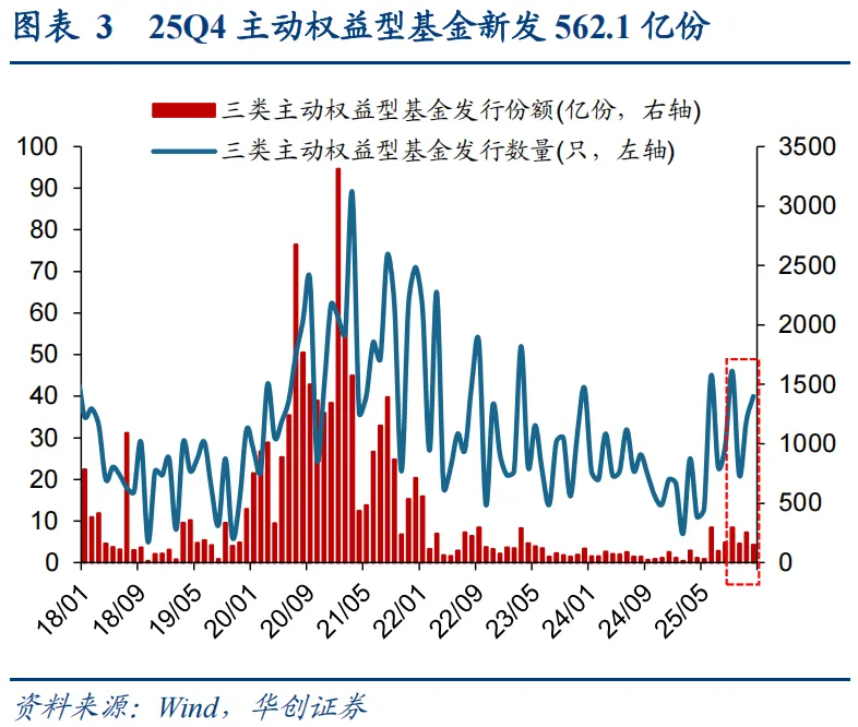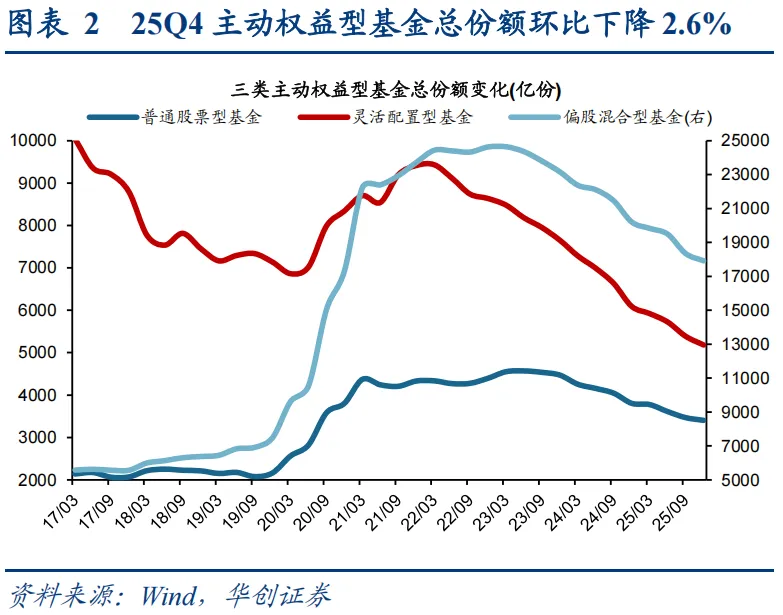 主动权益型基金Q4新发持续回暖,存量赎回明显下降。25Q4主动权益型基金数量上升58只、份额环比下降2.6%。从数量上来看,截至2025/12/31普通股票型、偏股混合型、灵活配置型三类主动权益型公募基金数量分别为589、2758、1337只,较25Q3分别增加5只(较25Q3增长0.9%,下同)、65只(2.4%)、-12只(-0.9%)。从份额上来看,当前普通股票型、偏股混合型、灵活配置型三类主动权益型公募基金份额分别为3403、17920、5183亿份,较25Q3分别变化-65亿份(-1.9%)、-428亿份(-2.3%)、-206亿份(-3.8%)。从发行来看,25Q4基金新发份额环比增长0.2%,10-12月发行规模分别为159、253、151亿元,合计562亿,季度新发较Q3基本持平。从申购赎回来看,25Q4主动偏股型基金存量赎回1261亿份,较25Q3赎回2184亿份下降。四季度市场呈现震荡走势,随着海外流动性和风险改善、“十五五”规划建议落地以及政治局会议等催化下,叠加以商业航天为代表的主题行情火热,市场风险偏好明显回升,推动基金新发规模持续回暖。同时,随着主动权益基金赚钱效应的回归,存量基金赎回规模出现明显下降。