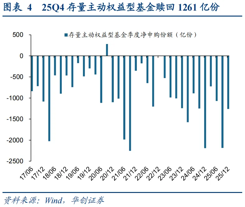 1、25Q4主动偏股新发562亿持续回暖,存量赎回明显下降、仓位下降。