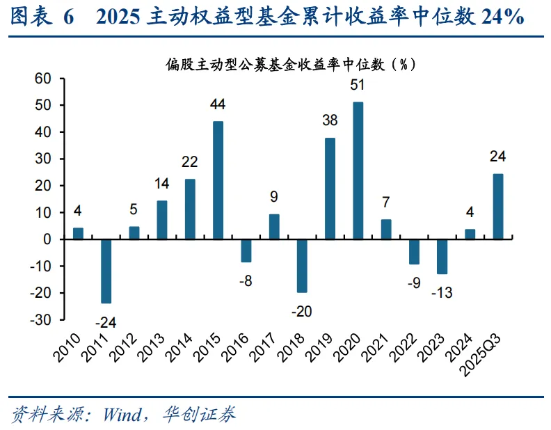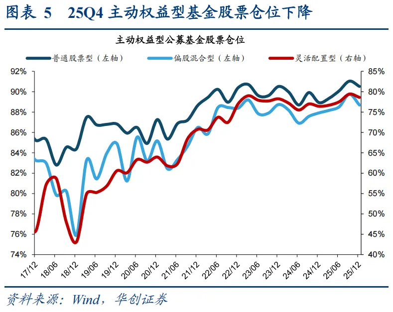 25Q4市场震荡,主动权益基金年内收益率较24年上升20%,股票仓位下降。从净值表现看,截至12月31日,三类主动权益型公募基金25年复权单位净值增长率中位数24%,较24年全年的4%大幅上升。从仓位看,25Q4普通股票型、混合偏股型、灵活配置型基金的股票仓位分别90.5%、88.7%、78.6%,较25Q3分别变化-0.5、-1.1、-0.8个百分点。