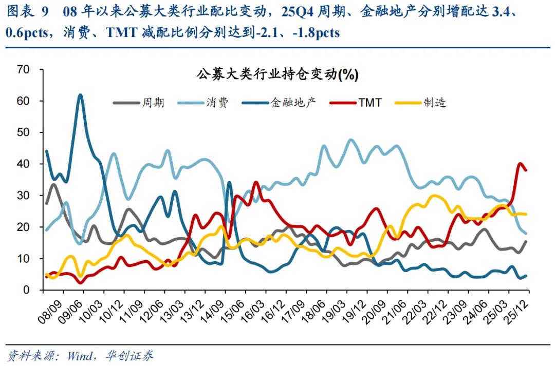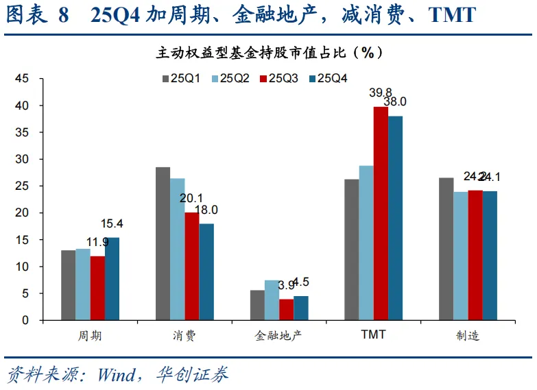 25Q4市场整体震荡,公募大类行业上增配周期、金融地产,减配消费、TMT。