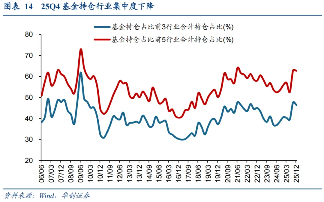 25Q4基金持股行业集中度下降。25Q4持股规模前三行业整体市值占比为46.5%,相较于25Q3变化-1.1pcts;前五行业整体市值占比为62.7%,相较于25Q3变化-0.2pcts。受市场震荡、主题行情火热影响,公募持股行业集中度下降。