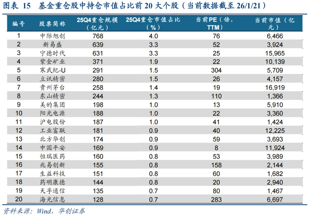 公募前二十大重仓股名单(不含港股)。主动权益型公募基金25Q4重仓股中,中际旭创、新易盛、宁德时代持股市值占比位列前三,重仓占比分别为4.0%、3.3%、3.3%。25Q4基金前20大重仓股对比25Q3出现6只个股更替,新进入个股:中国平安、生益科技、海光信息;退出个股:亿纬锂能、胜宏科技、深南电路。