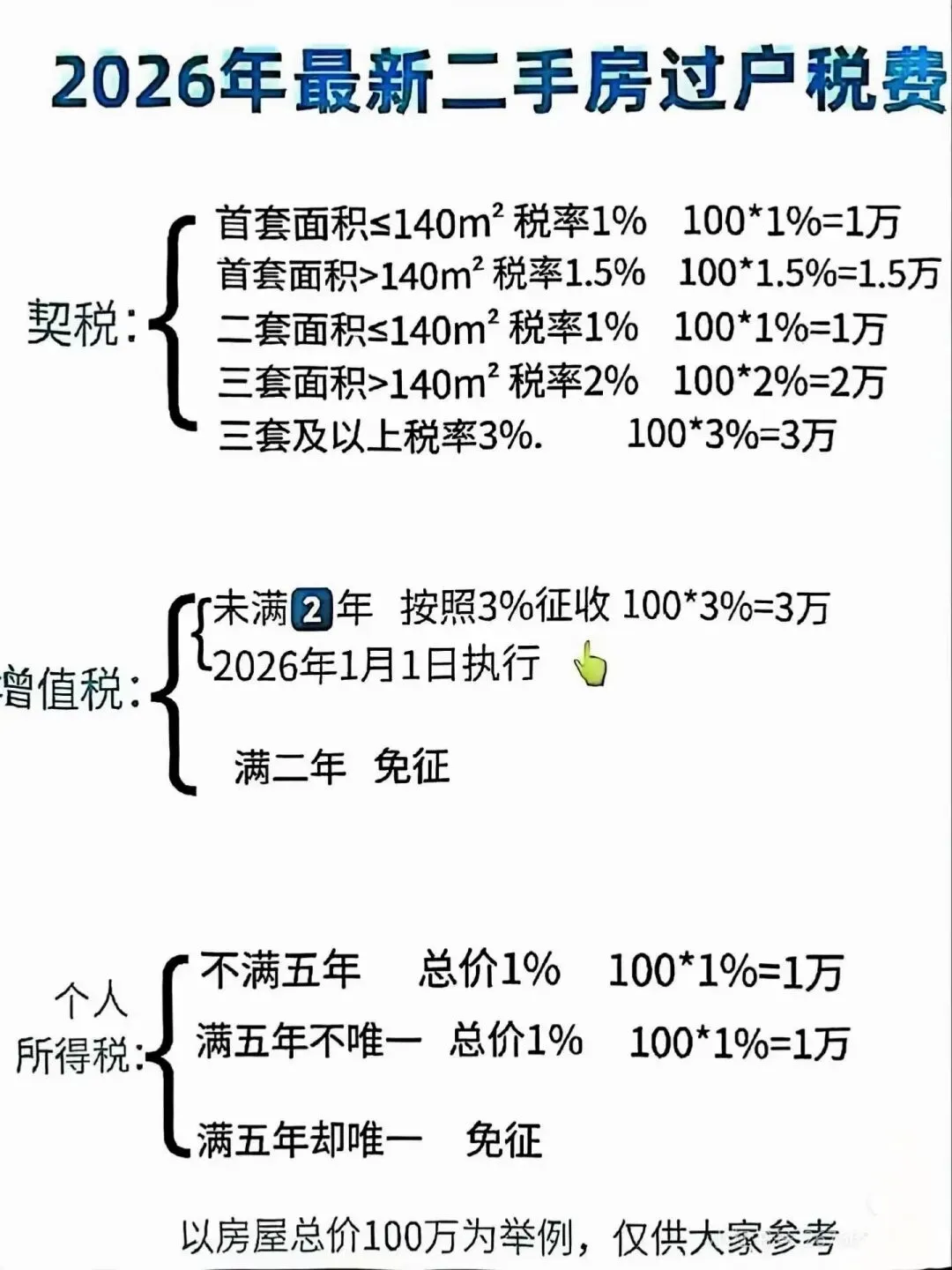 2026年最新房产契税,个税如下: