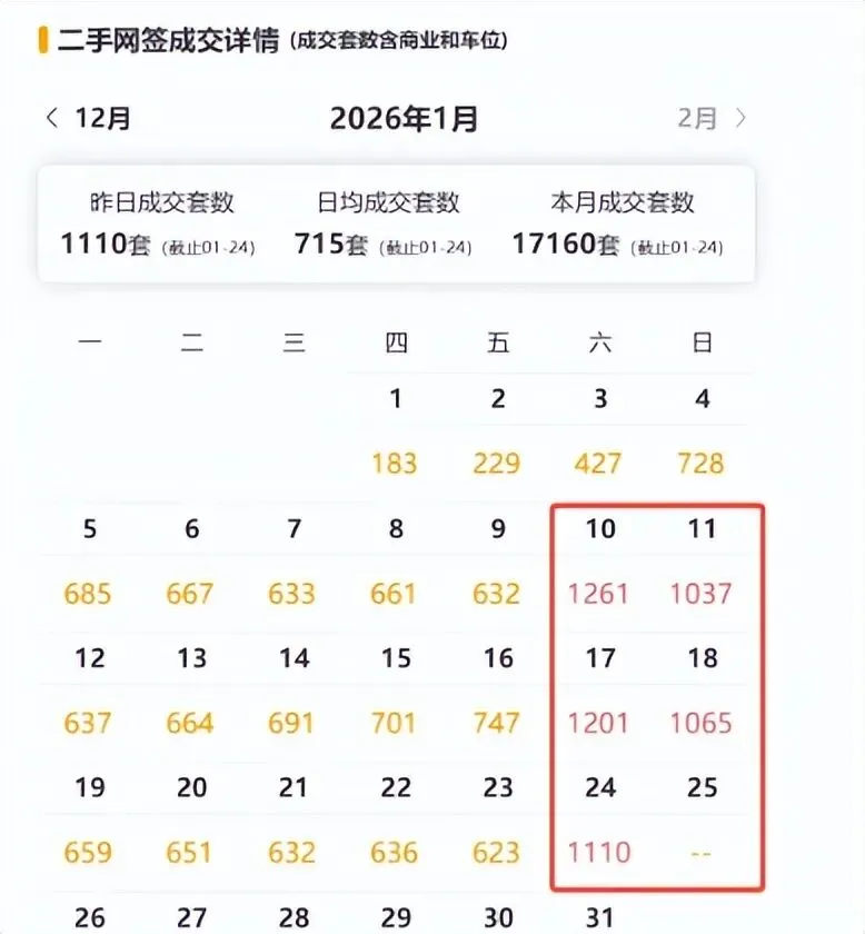 在2026年1月,上海楼市的二手房成交量也很高,大部分时间都是单日超过了600套的网签量,周末更是达到了1000套以上。