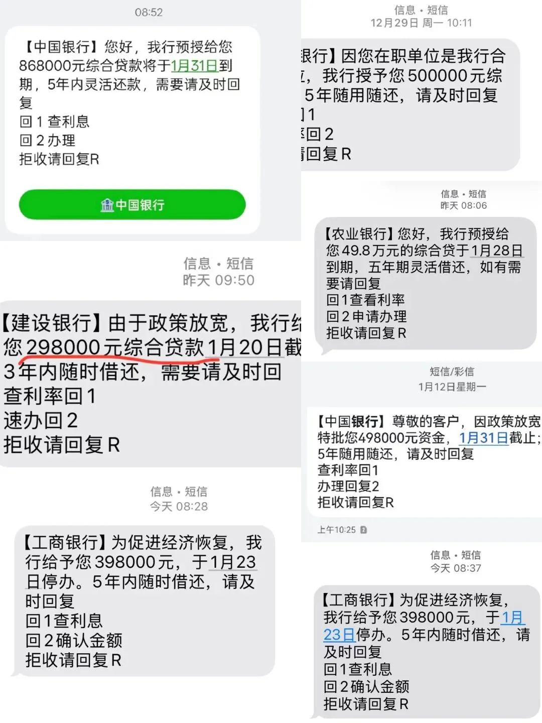 有86.8万、50万、49.8万、39.8万、29.8万……全部是贷款通知。