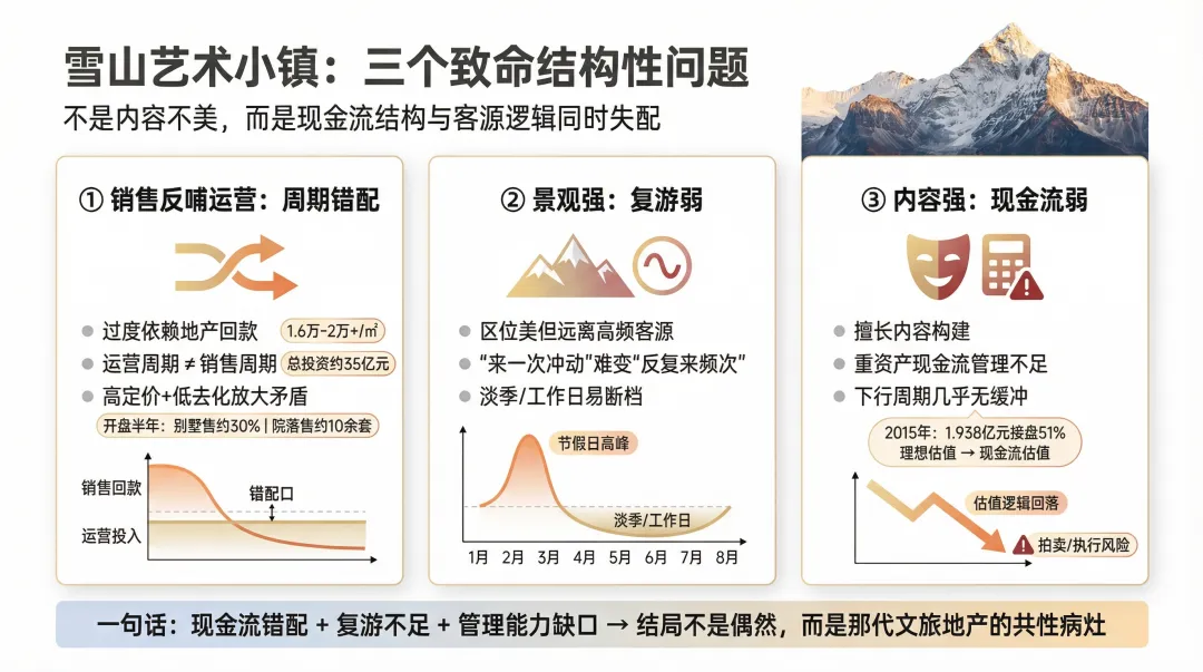其一,过度依赖地产销售来反哺长期运营,但文旅项目的销售周期与运营周期严重错配。雪山艺术小镇的矛盾就被“高定价+低去化”直接放大:前端用约1.6万元/㎡至2万元/㎡以上的价格带去支撑回款预期,后端却要背负约35亿元总投资口径下的长期投入,一旦开盘半年别墅仅售出约30%、商业院落仅售出10余套,运营与建设的现金流就会同时失血。其二,区位虽美,却远离高频客源市场,复游与常住逻辑不足。玉龙雪山的景观优势能带来“来过一次”的冲动,但很难自动生成“反复来”的生活频次,于是商业与配套很容易在淡季与非节假日出现客源断档。其三,操盘团队更擅长内容构建,而非重资产项目的现金流管理。当行业进入下行周期,这些问题被同步放大,几乎没有缓冲空间。更讽刺的是,2015年阳光100以1.938亿元接盘51%股权的价格,已经把“理想估值”打回“现金流估值”,但项目仍难逃后续进入执行与拍卖的命运,这类结局并非雪山艺术小镇独有,而是那一代文旅地产的共性病灶。