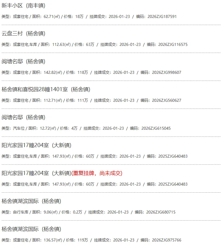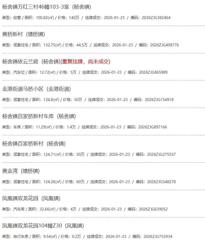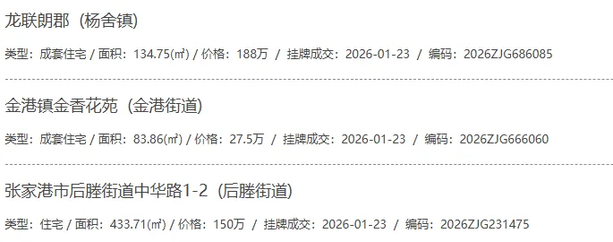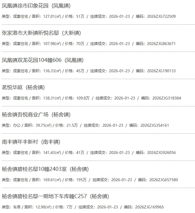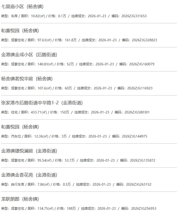 根据张家港房产网(www.zjgzf.cn)整理,(2026-01-23至2026-01-23)总共36套二手房网签挂牌成交(含自行车库及汽车库),数据根据住建局官方网签平台整理,并已同步至各对应小区的成交明细,特别提醒:此处数据及各小区成交数据中凡标注(来自网签挂牌)的,均是根据政府网签挂牌系统整理,价格可能不准,请谨慎采信;并仅作为您买房卖房的参考而非决定依据。以下为数据明细: