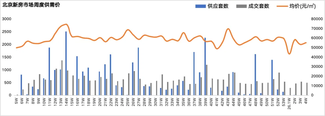 上周(1.19-1.25)北京新房市场无新增供应,成交504套,面积约6.28万㎡,环比微降7%。成交均价却稳中有升,达到55185元/㎡,环比上涨3%,成交金额36.65亿元,与上周基本持平。