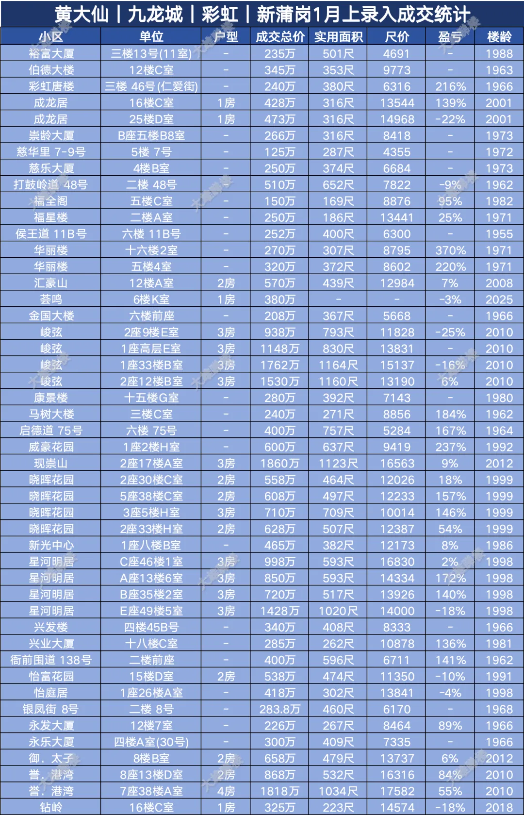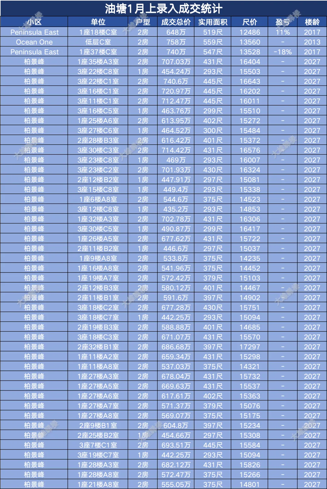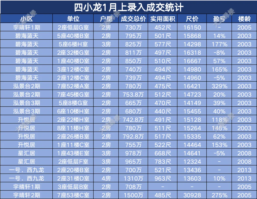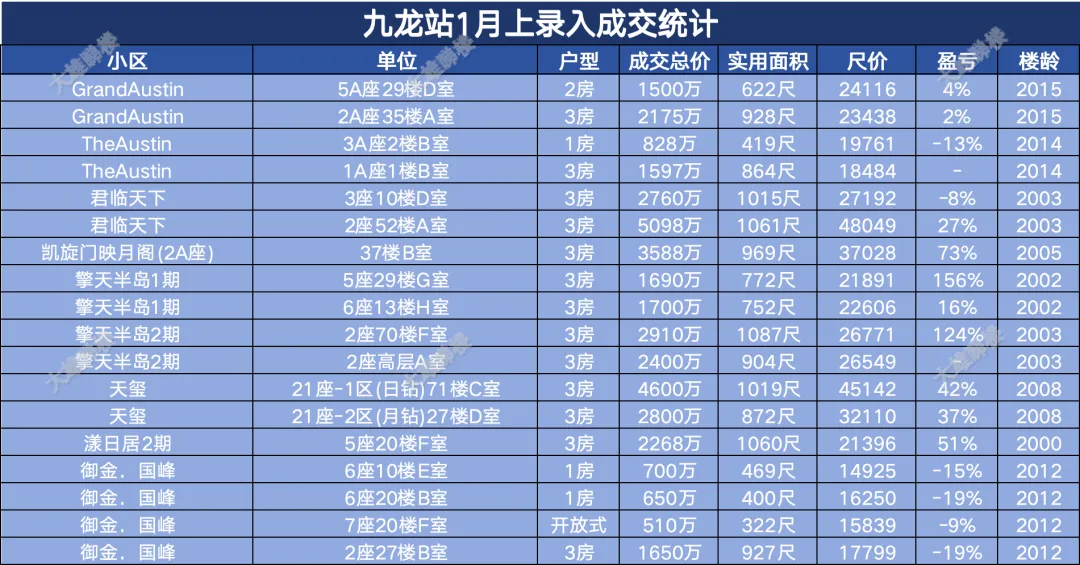 今天统计的是九龙区1月份上半月的成交,包括西九龙、启德新区、奥运站、何文田、九龙塘、观塘、油塘、红磡、旺角等。(统计时间为2026年1月1日至1月15日)