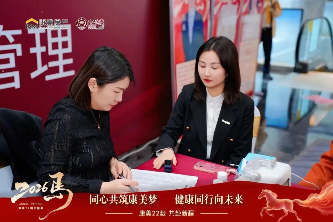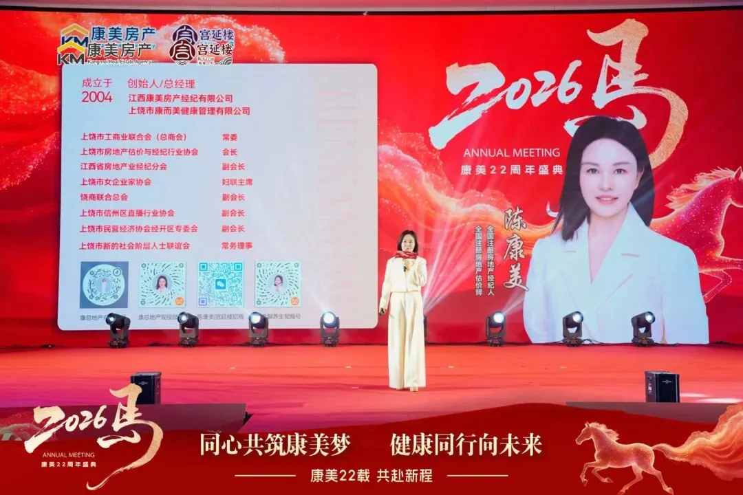 康美房产创始人陈康美女士演讲的字里行间满是初心与力量:“22年前,康美从1家小店起步,带着‘让上饶人住得更安心’的朴素心愿扎根故土。22年里,我们穿越市场周期、见证行业迭代,始终守着‘专业、诚信、合作、共赢’的初心,从1家门店到80+的这份成长,离不开每一位康美人的并肩拼搏,离不开客户的信任托付,更离不开伙伴们的鼎力支持!”“今天‘房产+健康’的战略升级,绝非偶然,而是对市场需求的深刻洞察,更是对‘服务有温度’的执着坚守。健康是根本,居住是幸福载体,两者相融,才是美好生活的完整模样。未来,我们将把健康服务植入交易全流程、融入社区生活,让选择康美的客户,既得理想居所,更享健康生活。”