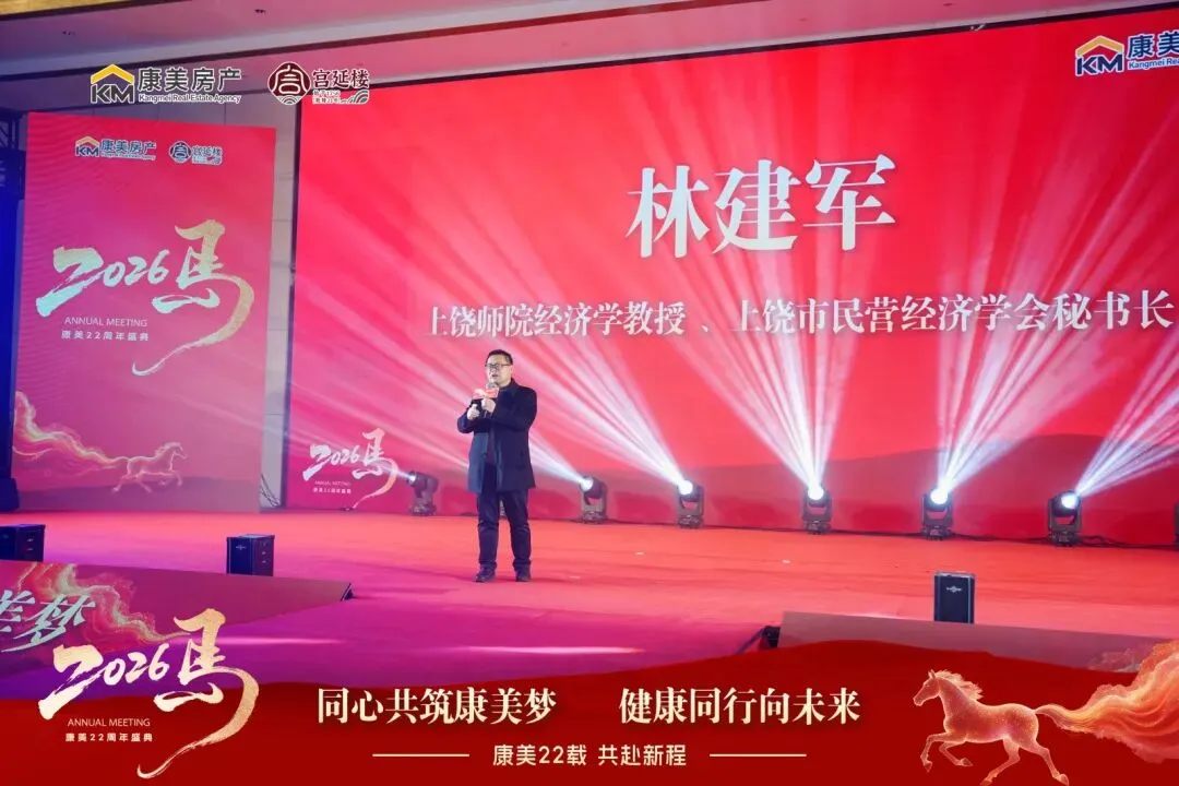 伴随着激昂的司歌旋律与震撼人心的士气展示,盛典的荣耀时刻正式拉开帷幕。林建军教授亲临致辞!作为上饶师院经济学教授、市人大常委会聘任专家,上饶市民营经济学会秘书长,出版经济学专著3部,发表经济学论文50多篇等。他从区域经济趋势与民营经济创新路径切入,高度肯定康美22载扎根本土的稳健底色,更盛赞“房产+健康”战略升级——既精准契合居民消费升级需求,也为本土企业跨界融合树立了优秀范本,以权威视角为康美未来发展注入强劲信心。