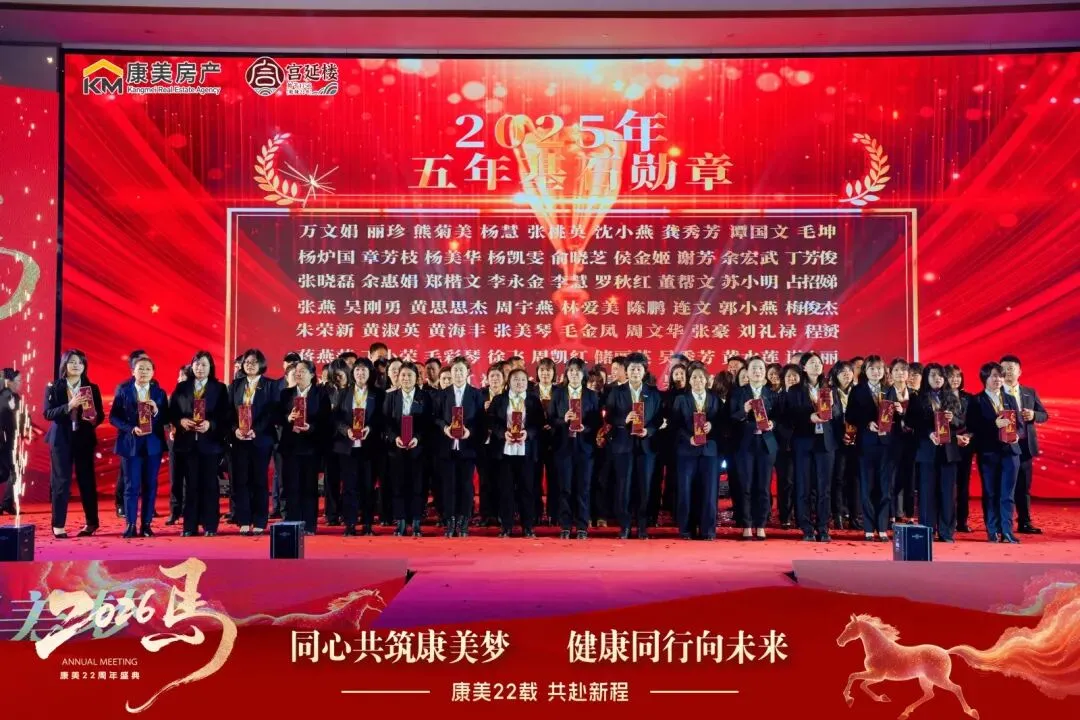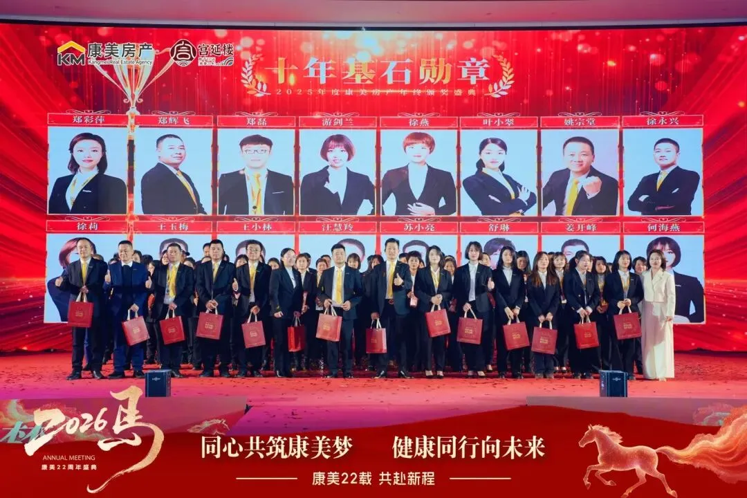 聚光灯下,每一份荣誉都是奋斗的勋章:租赁王、实勘王、房钥匙王、房源王、敬业奖、新媒体之光、优秀职能、优秀法务、十佳经纪人、个人及团队业绩冠亚季军、百万门店、等各类奖项逐一揭晓。五年、十年基石勋章的颁发,让现场掌声不息 —— 他们以坚守见证康美成长,成为品牌最坚实的底气!