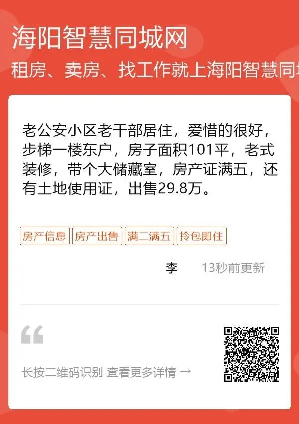 房产信息如何发布注意:新用户登录平台即送10金币最少可以免费发布3条信息!后期需要继续发布可以联系客服或者充值金币发布【注:金币一经充值无法退款请您按需谨慎操作!】新用户识别上方⬆二维码可以免费发布3条信息!后期需要继续发布可以联系客服或者充值金币发布老公安小区老干部居住,爱惜的很好,步梯一楼东户,房子面积101平,老式装修,带个大储藏室,房产证满五,还有土地使用证,出售29.8万。