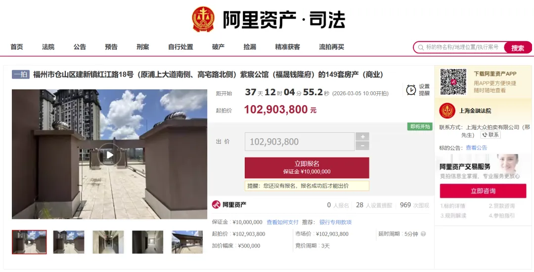 日前,上海金融法院发布一则拍卖公告,将于今年3月5日至3月8日在阿里法拍平台上对福州市仓山区紫宸公馆(福晟钱隆府)149套商业房产进行网络司法拍卖活动。