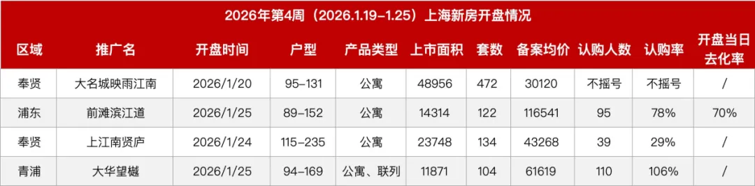 其中,浦东“前滩滨江道”推出89-152平方米公寓产品,上市面积14314平方米、122套房源,备案均价116541元/平方米,吸引95组客户认购,认购率78%,开盘当日去化率达70%;青浦“大华望樾”推出94-169平方米公寓、联列产品,认购率达106%,表现亮眼;奉贤两个开盘项目“大名城映雨江南”未摇号,“上江南贤庐”认购率仅29%,反映出不同区域、不同项目的开盘表现分化明显。