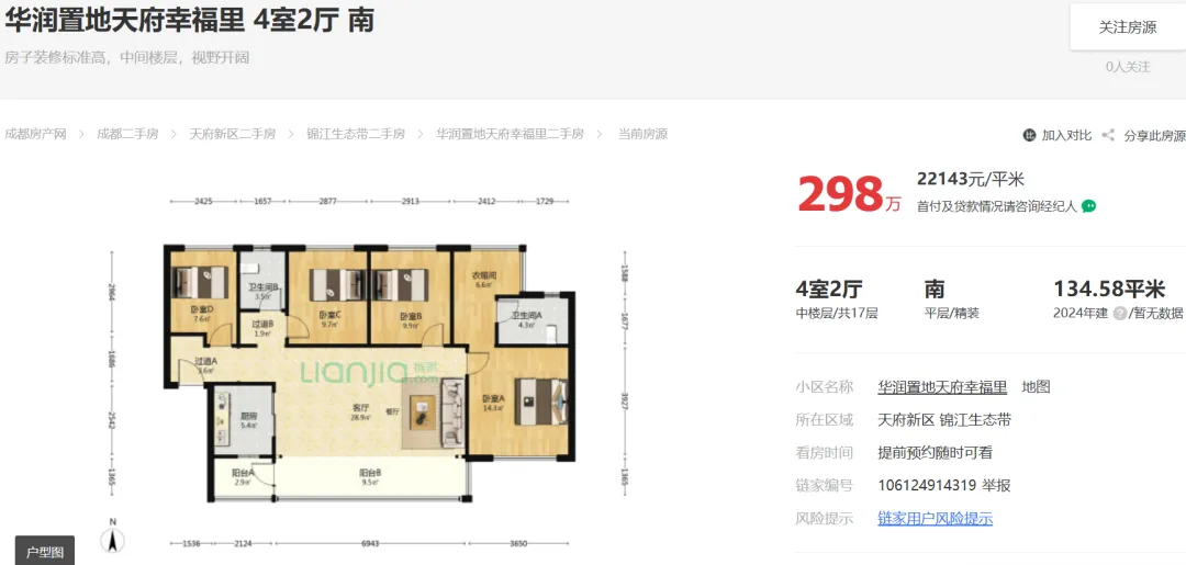 2026年01月01日,【那坊归心】成都龙泉驿东安湖存量房(二手房)华润未来之城二期建面134平套四报价208万,是否适合90后?