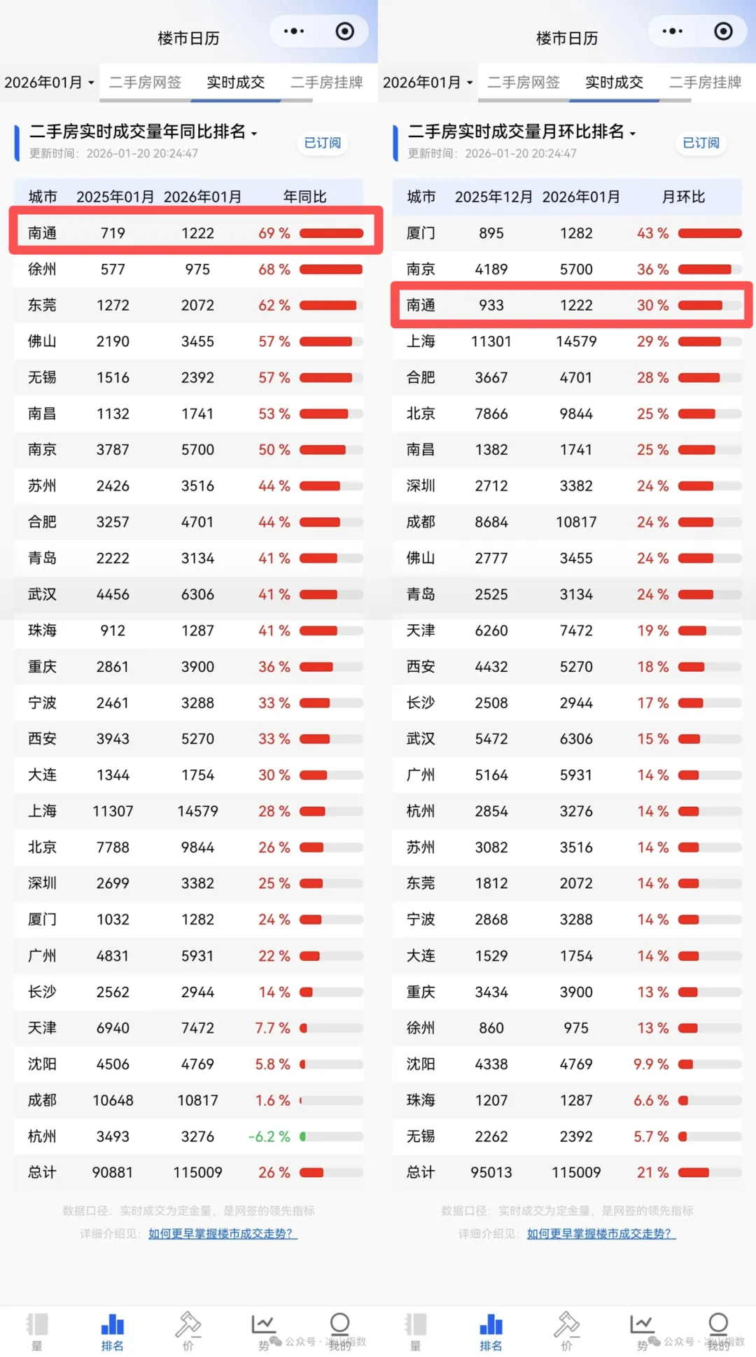 更为值得注意的是,南通1月份二手房成交量的环比涨幅也达到了30%,稳居全国前三,远超北京、上海、深圳等一线城市的表现。