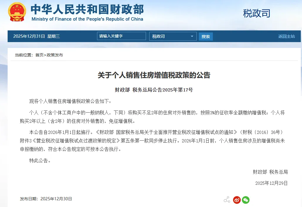 个人卖房增值税优惠:个人出售不满2年的住房,增值税从5.3%降至3.3%,满两年则继续免征,降低了二手房交易成本,促进了流通。