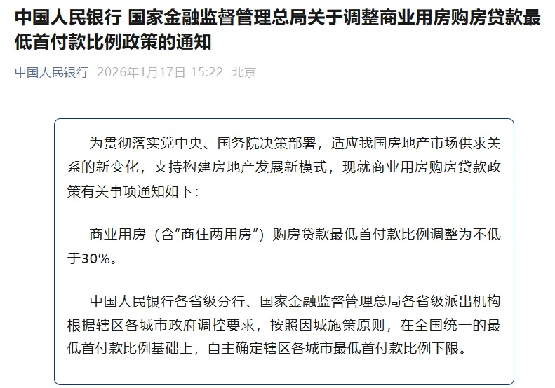 1月17日,中国人民银行会同金融监管总局调整商业用房购房贷款政策,将商业用房(含“商住两用房”)购房贷款最低首付款比例调整为不低于30%,有效降低了商办类物业的入市门槛。