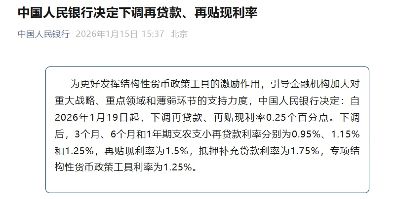 1月19日起,央行下调再贷款、再贴现利率0.25个百分点,进一步改善了市场流动性环境。