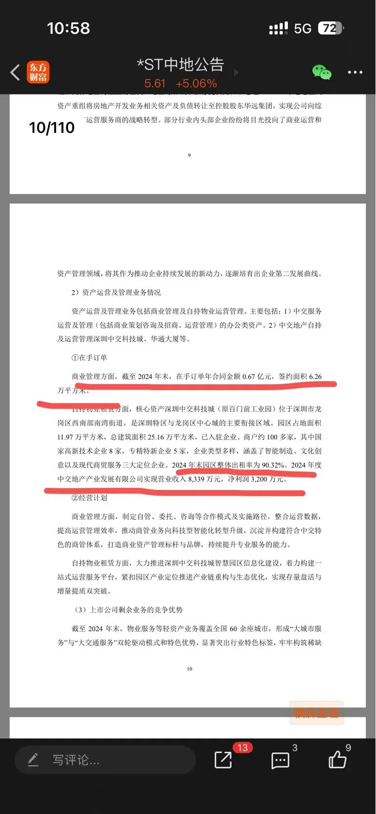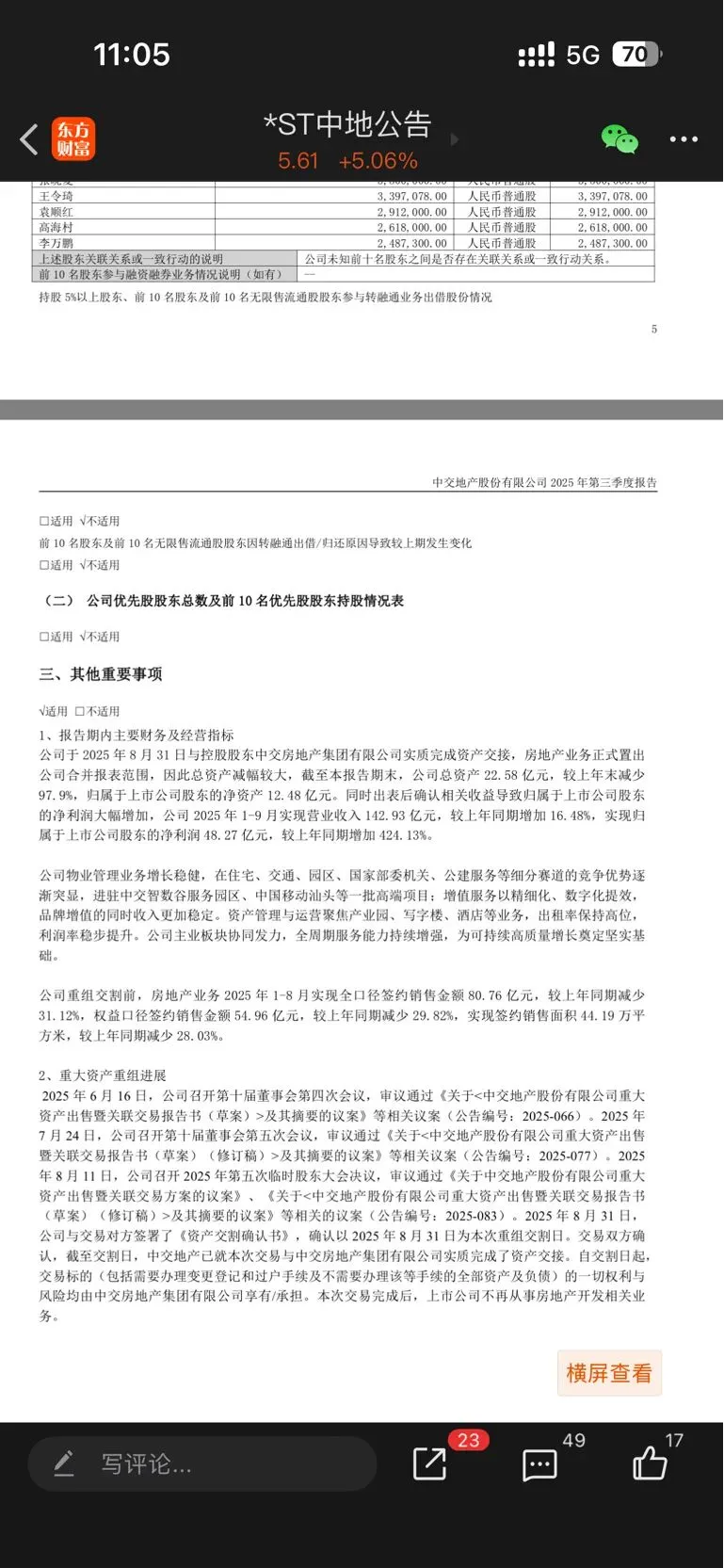 中地营收超过3亿且净资产为正,2024年报为标准无保留意见,符合摘帽,扣非这块三季度房地产开发是并表的,所以是负,但这不影响,有人担心每十天会会发终止上市上市公告是多余的